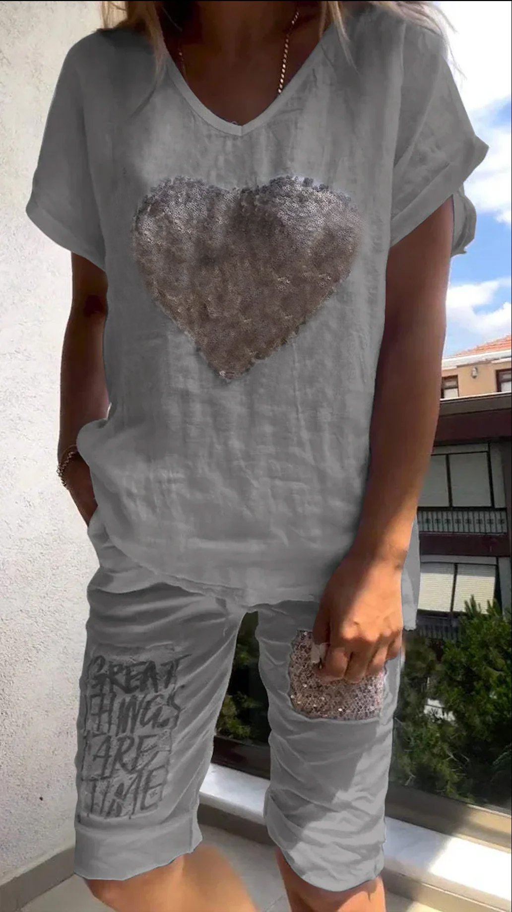 V-neck Love Sequin Casual Two-piece Suit (Buy 2 Sets Free Shipping)